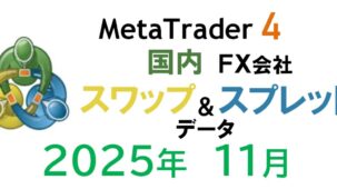 2025年11月のMT4対応国内FX会社が提供するスワップとスプレッドの過去データです。各FX会社のスワップやスプレッドの変化を調べることができます。取引する通貨ペアの過去データをFX会社ごとに比較して、取引に使用するFX会社の選定にお役立てください。