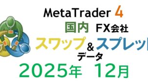 2025年12月のMT4対応国内FX会社が提供するスワップとスプレッドの過去データです。各FX会社のスワップやスプレッドの変化を調べることができます。取引する通貨ペアの過去データをFX会社ごとに比較して、取引に使用するFX会社の選定にお役立てください。