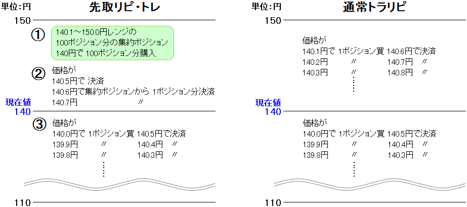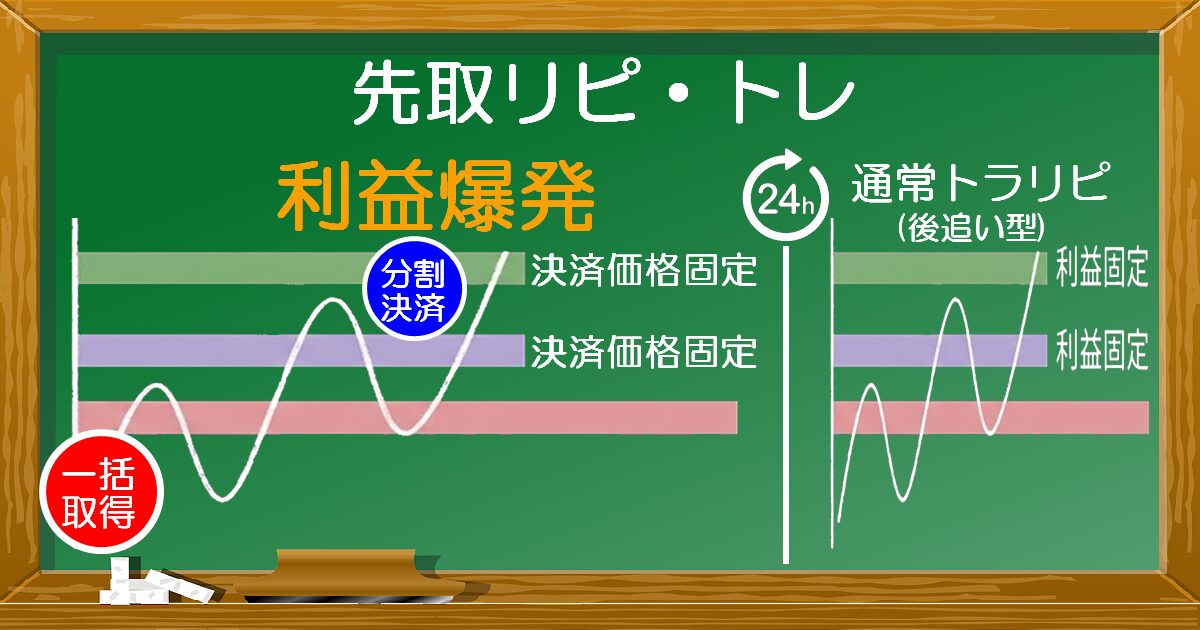 | 先取リピ・トレの戦略 (先回り型) | 通常トラリピ (後追い型) |