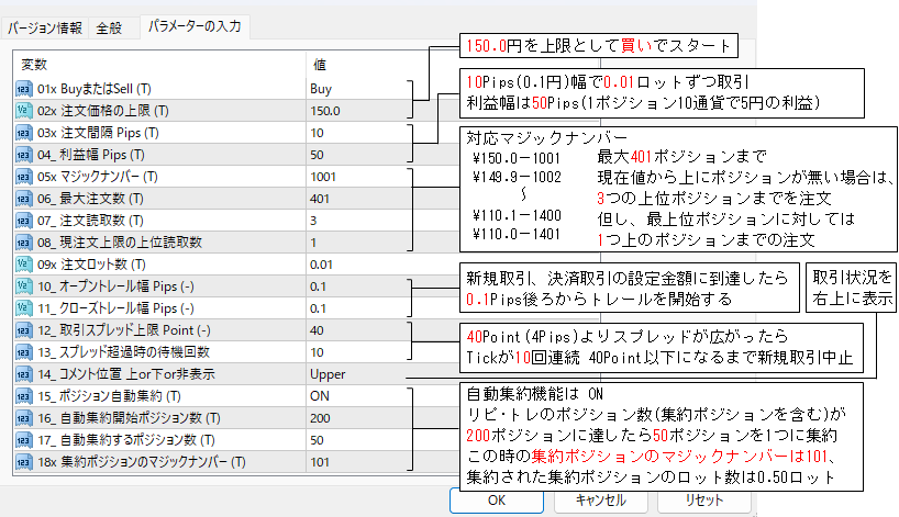 自動売買を開始した時の画面パラメータ (画面右下)は次のようになります。パラメータの詳細情報はこちらから確認してください。