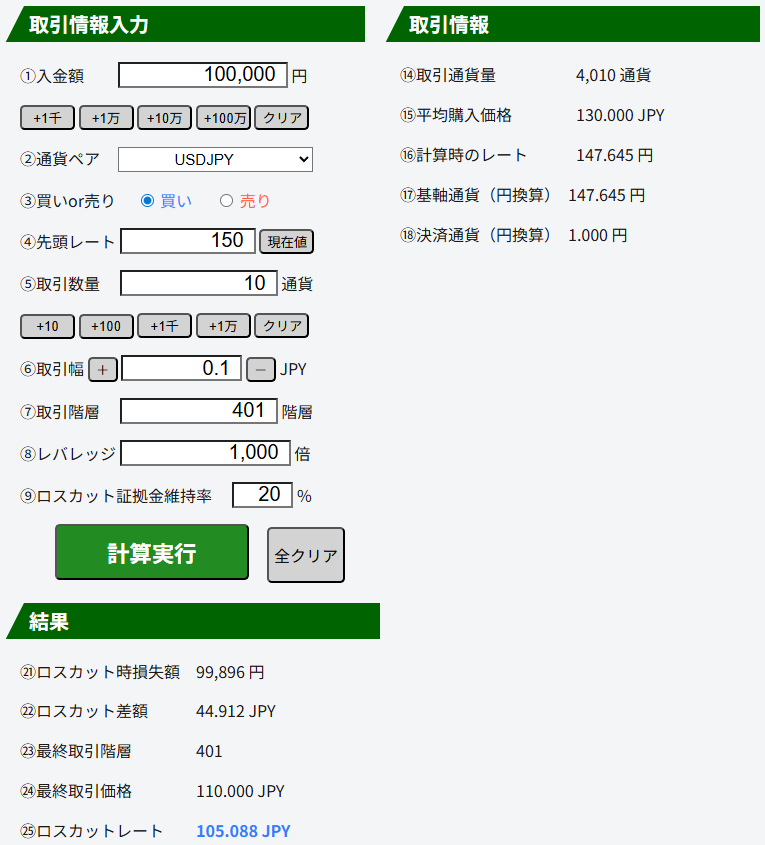 | USDJPY | 10万 | 150~110 | 10 | 0.1 | 105.088 |