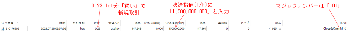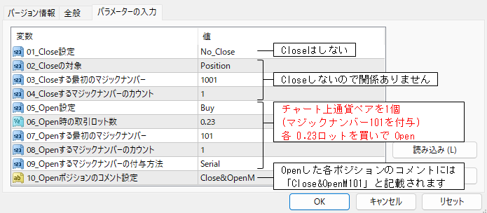 例では 1ポジションあたりの通貨量は 10通貨なので 240通貨 ( 24ポジション × 10通貨 ) を 1ポジション分、マジックナンバー「101」で「買い」の新規取引をします。