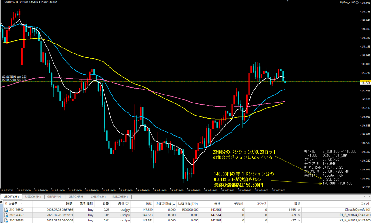 - 分割決済:140.1円以上のポジションは集約ポジションを分割決済。